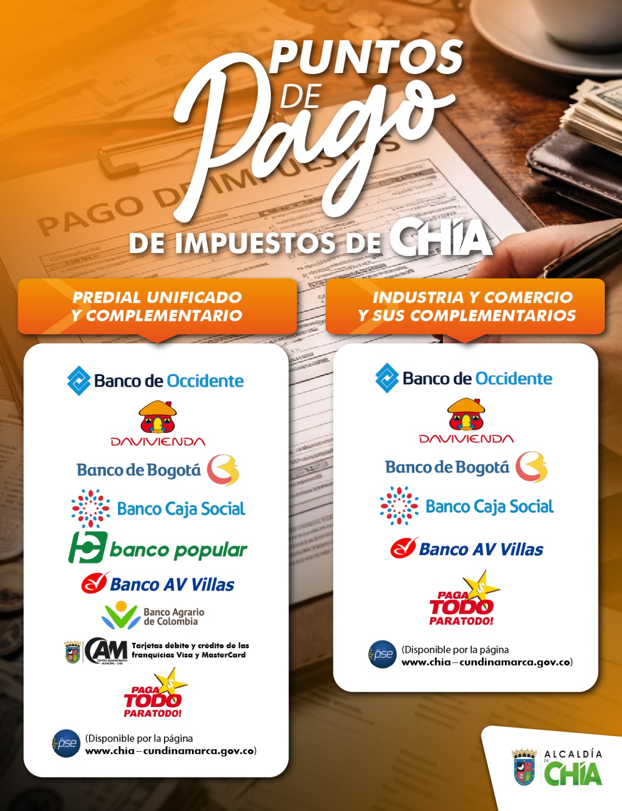 Los pagos de las obligaciones tributarias solo se pueden realizar directamente en la plataforma web o con el formulario físico para pagar en los bancos o corresponsales bancarios autorizados, este se descarga directamente desde la página web de la Alcaldía www.chia-cundinamarca.gov.co siguiendo la ruta: Tramites y Servicios / Impuesto Predial.